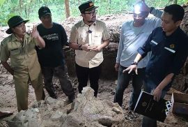 Wakil Bupati (Wabup) Nganjuk, Trihandy Cahyo Saputro, secara langsung meninjau proses ekskavasi fosil Stegodon trigonochepalus atau gajah purba di Kawasan Hutan Tritik, Desa Tritik, Kecamatan Rejoso, Kabupaten Nganjuk, Jawa Timur (Jatim), Selasa (21/10/2025). Penemuan fosil yang nyaris utuh ini menjadi perhatian serius Pemerintah Kabupaten (Pemkab) Nganjuk. Untuk mencapai titik temuan fosil, Wabup yang akrab disapa Mas Handy ini harus menyusuri jalan sempit, berkelok dan menanjak.