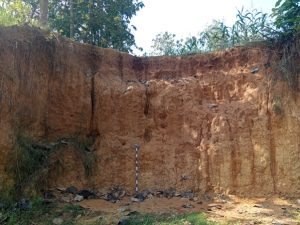 Fitur lokal yang menonjol adalah adanya beberapa titik sentra produksi batu bata dan genteng tanah liat di sekitar kaki perbukitan. Tanah liat ini kemungkinan berasal dari pelapukan batuan sedimen setempat (Gambar 2). Lapisan tanah yang tebal membuat singkapan batuan segar jarang dijumpai, sehingga pemetaan menjadi kunci untuk memahami distribusi dan karakter batuan di bawah permukaan. Hasil kegiatan ini dapat membantu pada pemahaman potensi bahan baku industri lokal, penentuan sebaran tanah subur untuk pertanian, serta penjelasan hubungan antara struktur geologi dengan tata guna lahan di wilayah ini.