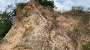 Singkapan yang Berada pada Area Pertambangan Pasir Kuarsa (Perselingan Batupasir Kuarsa – Batulanau dengan Jurus perlapisan N286E/66NW (kiri) dan N93E/68SW (kanan))